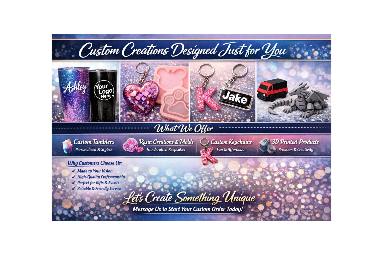 We specialize in high-quality, fully customized products that turn your ideas into unique, one-of-a-kind pieces. Whether you’re shopping for a meaningful gift, personal use, or business branding, every item is made with attention to detail and designed to stand out.